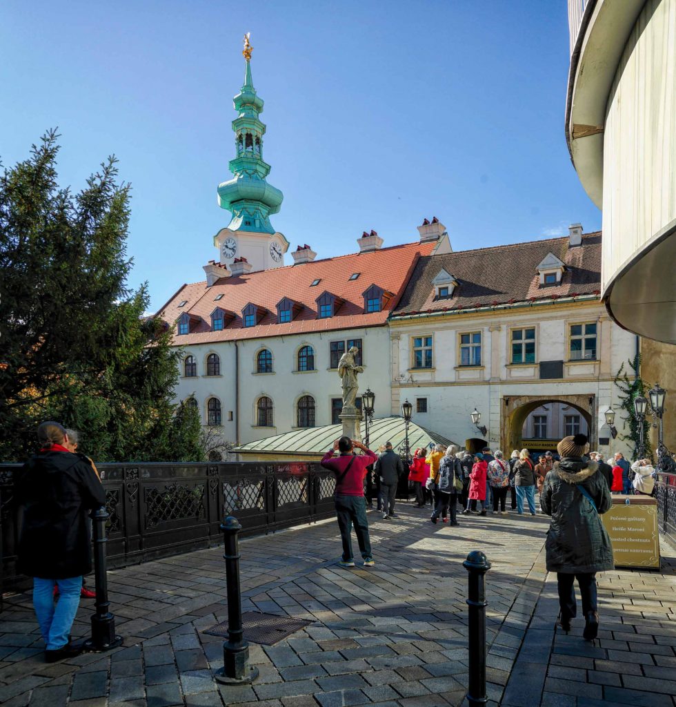 Die charmante Altstadt ist kompakt und lässt sich gut zu Fuß erkunden. Sie versprüht eine entspannte, fast mediterrane Atmosphäre. Besonders bekannt ist das Kunstwerk „Man at Work“, eine Bronzefigur, die aus einem Kanaldeckel blickt und zu den Markenzeichen der Stadt gehört. Ein weiterer Blickfang ist das Palais Grassalkovich, der heutige Amtssitz des Präsidenten, das mit seiner eleganten weißen Fassade beeindruckt.