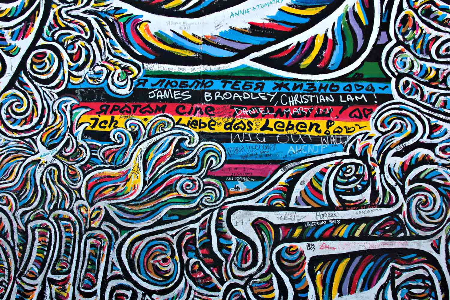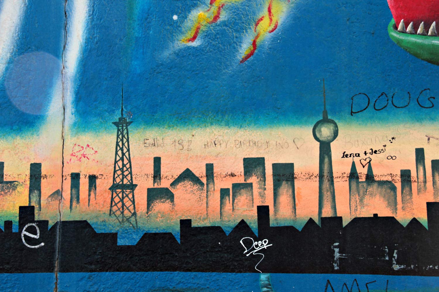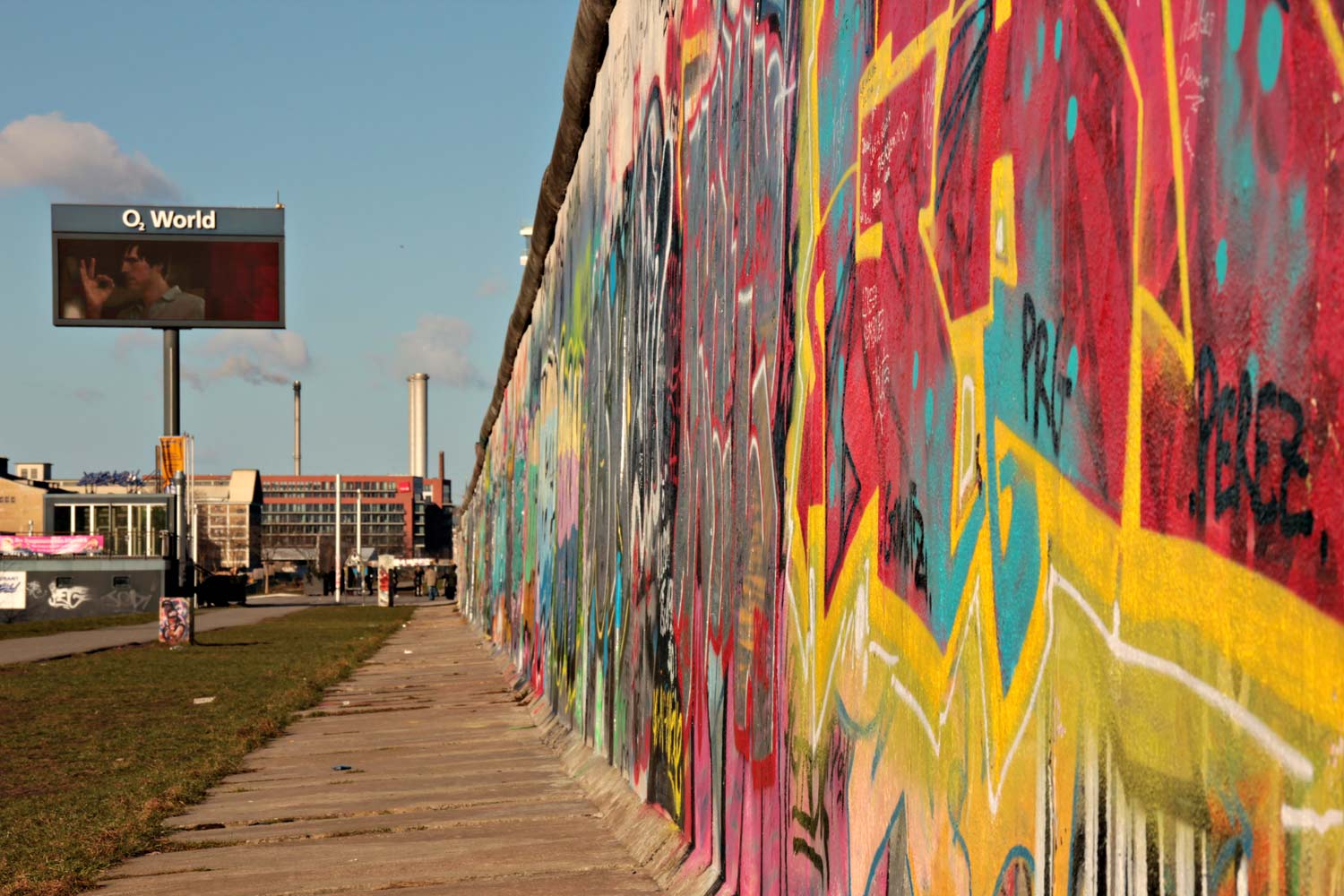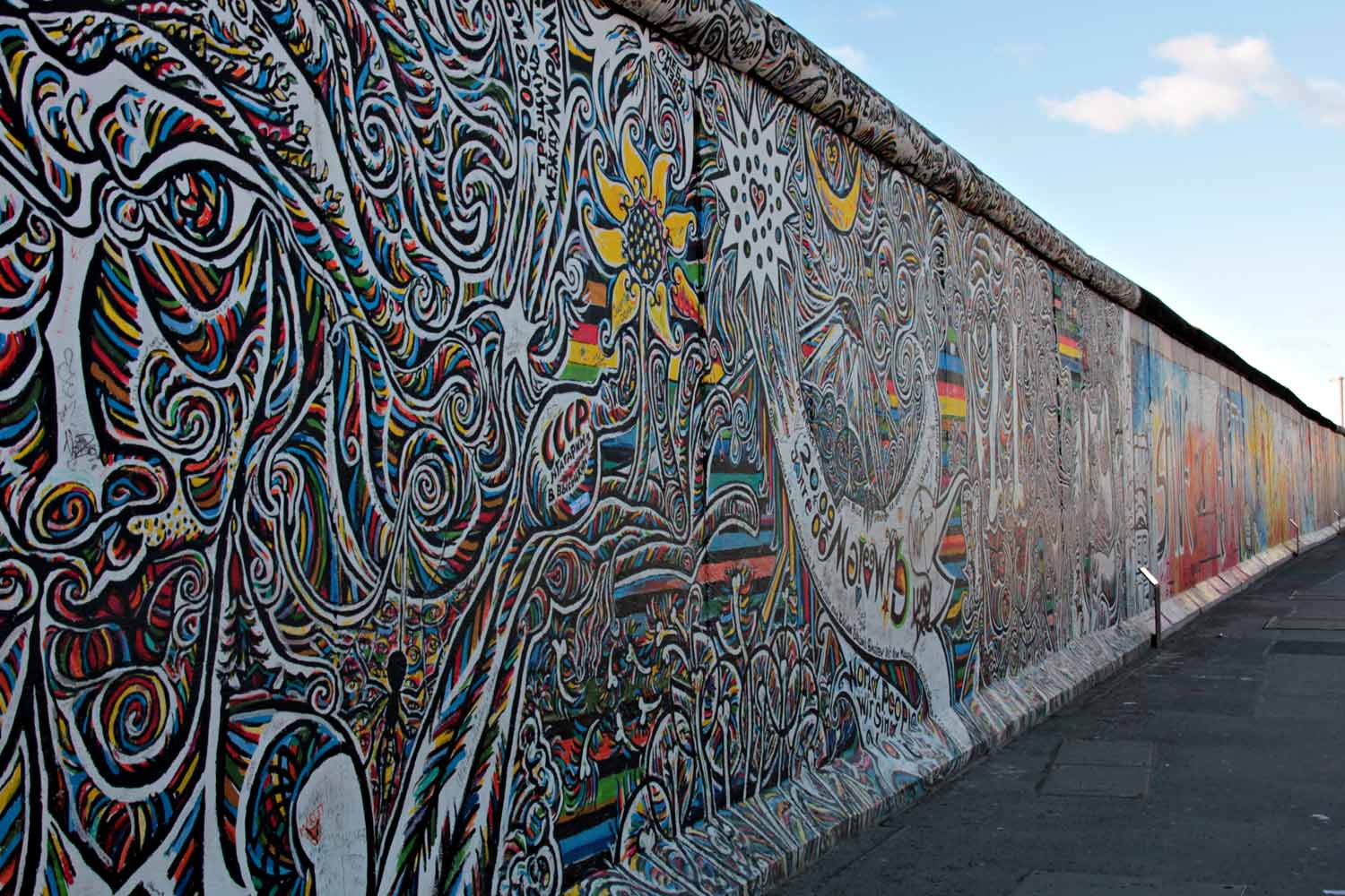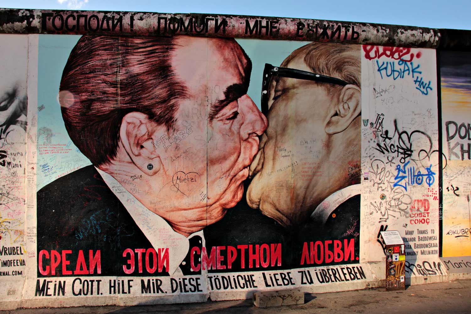 Ein Stück deutsche Geschichte: die East Side Gallery. Sie ist das längste erhaltene Teilstück (1316 m) der Berliner Mauer zwischen dem Berliner Ostbahnhof und der Oberbaumbrücke entlang der Spree. Hier findet man Gemälde, die die politischen Veränderungen der Jahre 1989/90 darstellen, wie zum Beispiel Szenen der Passkontrollen zwischen Ost und West oder der berühmte Bruderkuss zwischen Breschnew und Honecker, der um die Welt ging.