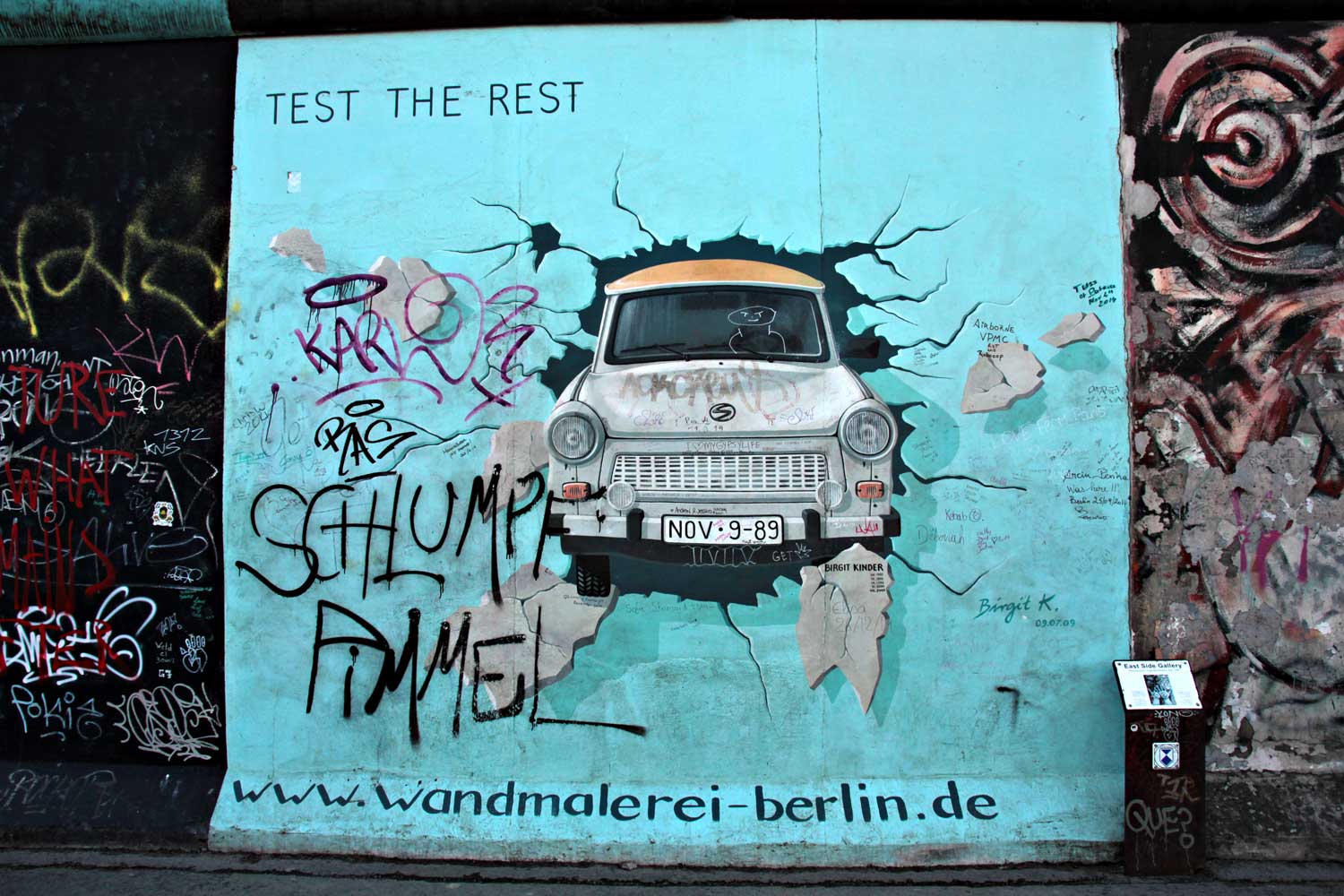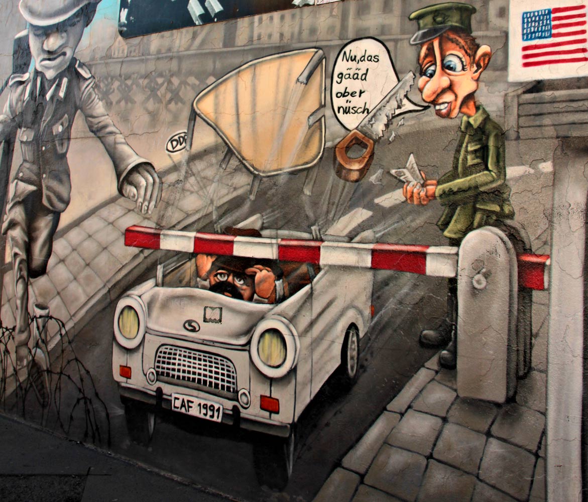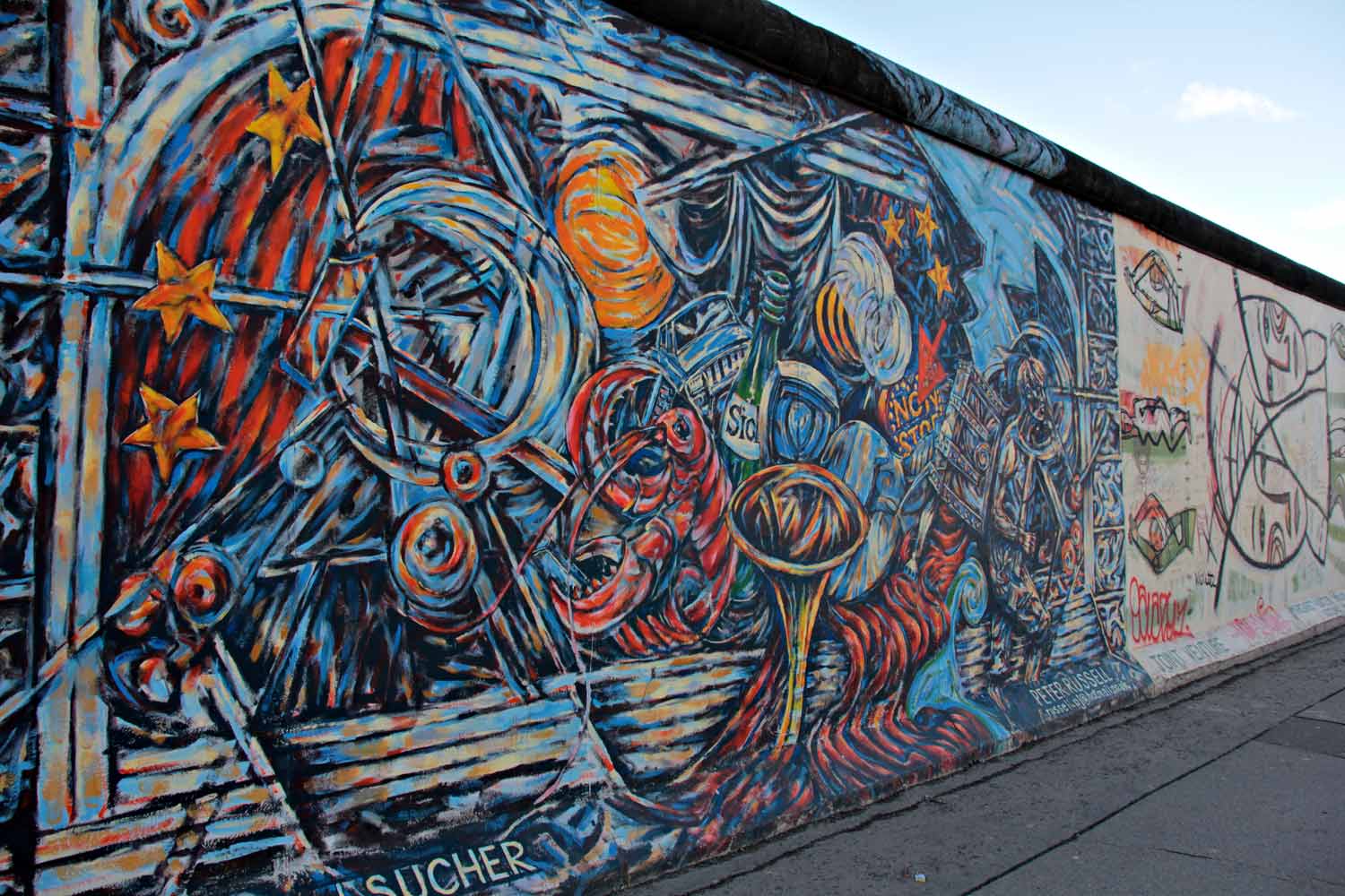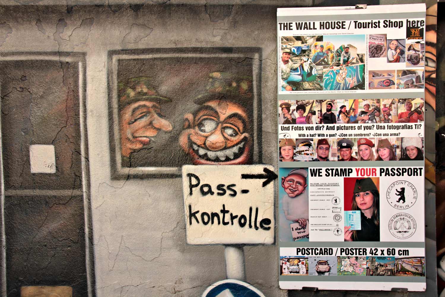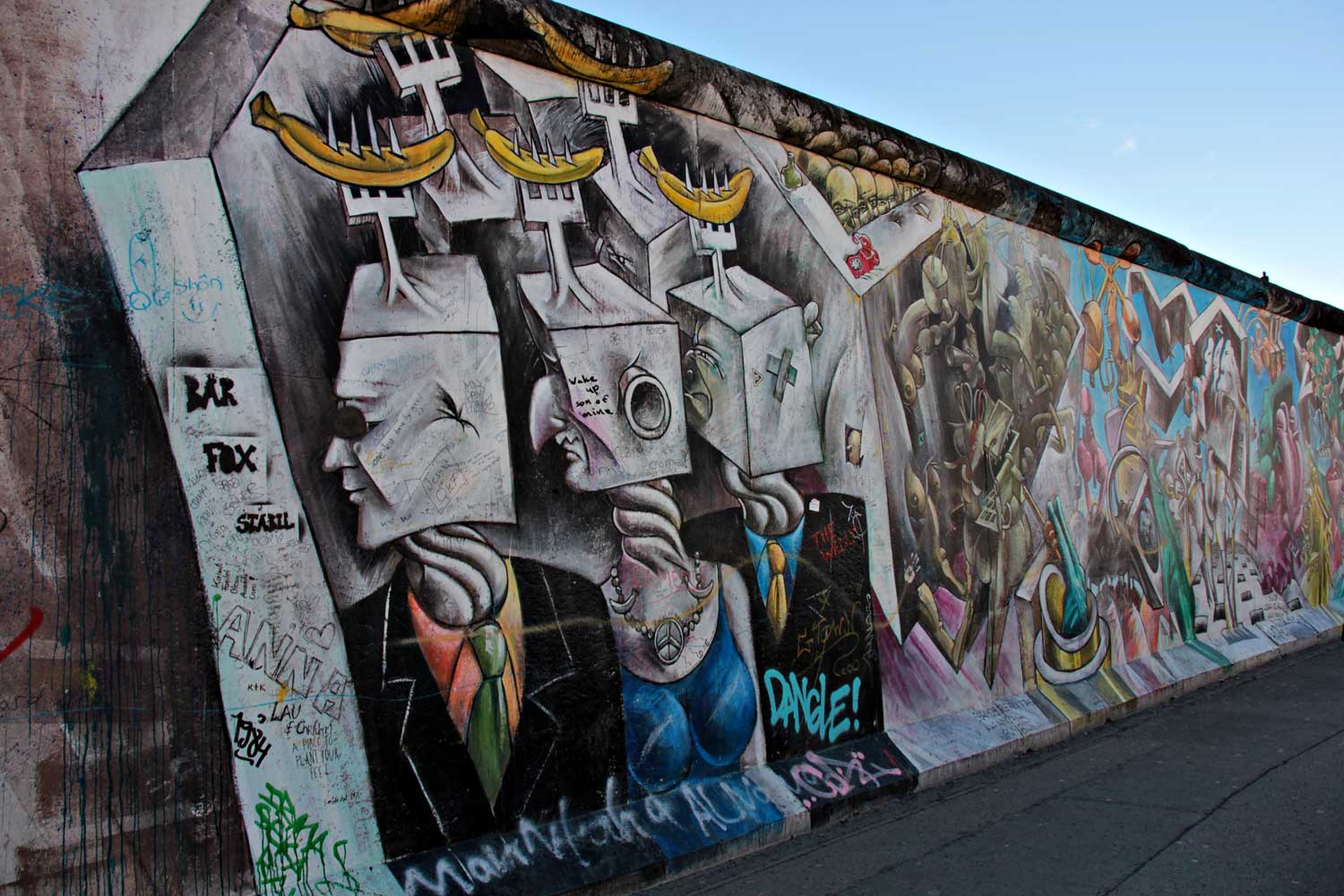 Ein Stück deutsche Geschichte: die East Side Gallery. Sie ist das längste erhaltene Teilstück (1316 m) der Berliner Mauer zwischen dem Berliner Ostbahnhof und der Oberbaumbrücke entlang der Spree. Hier findet man Gemälde, die die politischen Veränderungen der Jahre 1989/90 darstellen, wie zum Beispiel Szenen der Passkontrollen zwischen Ost und West oder der berühmte Bruderkuss zwischen Breschnew und Honecker, der um die Welt ging.