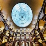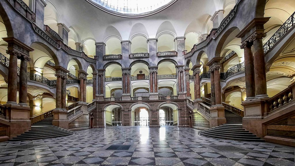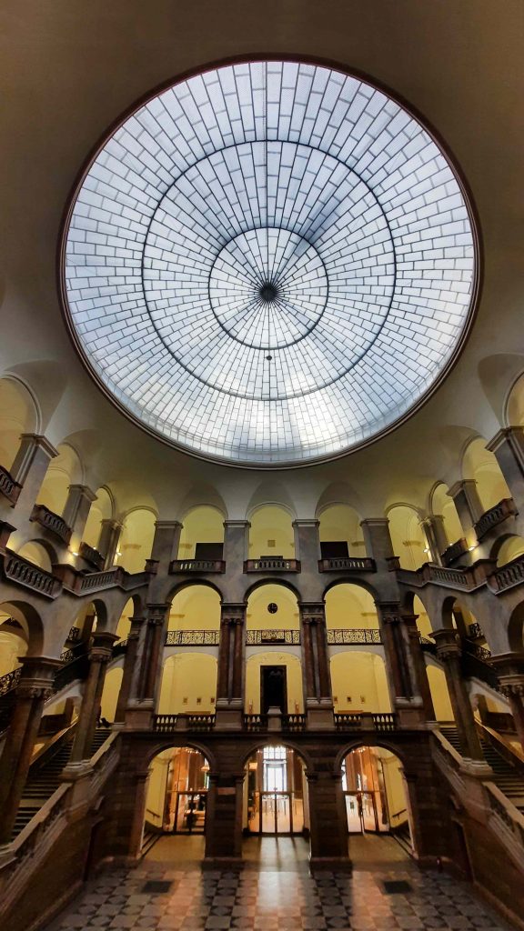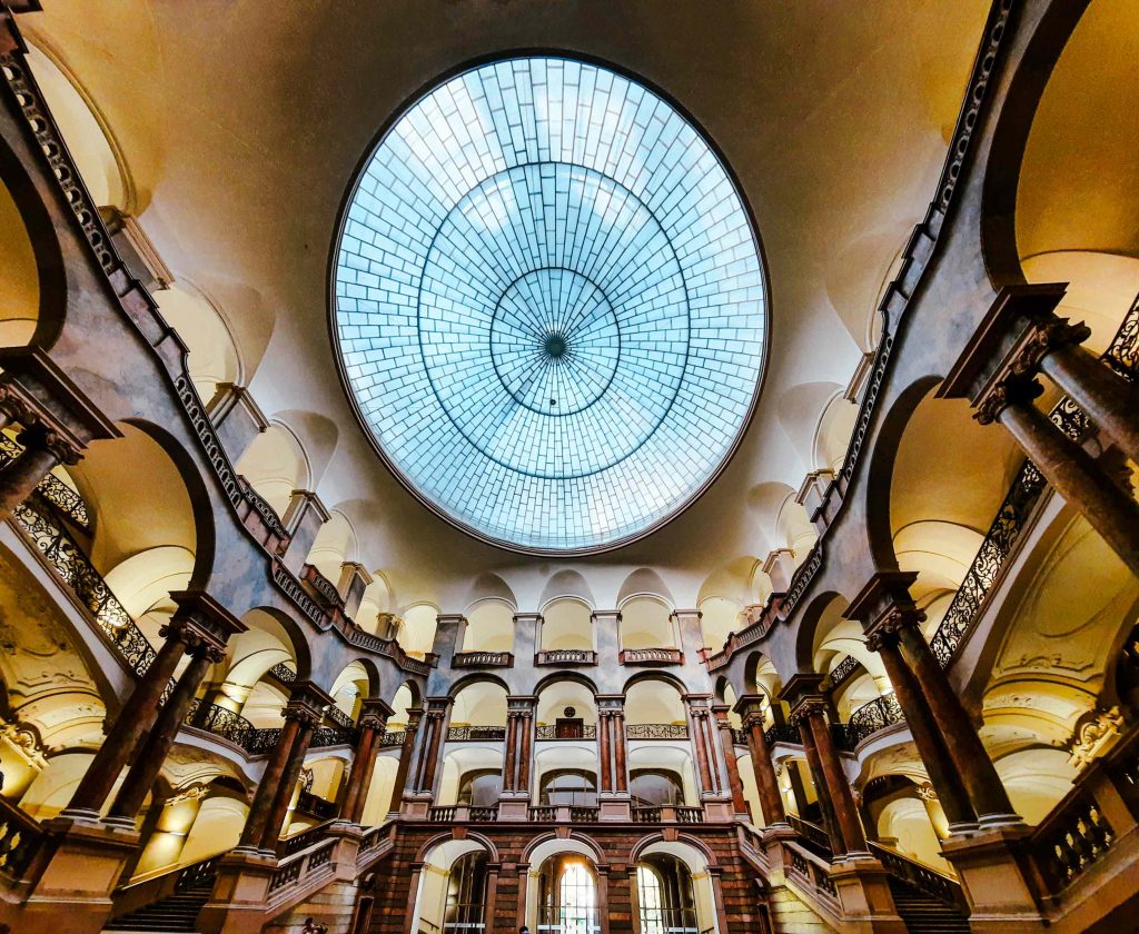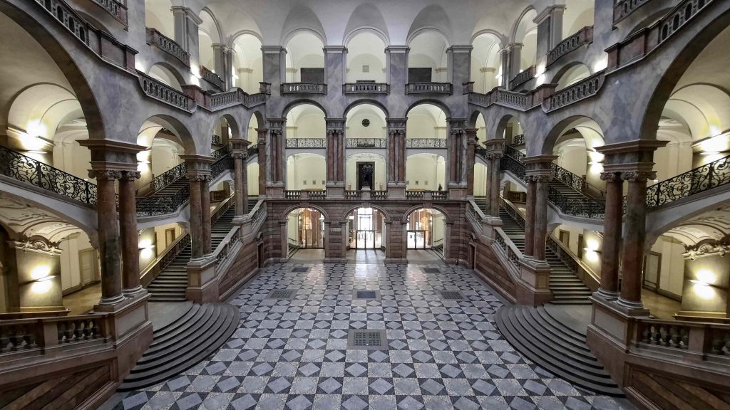 Die Eingangshalle beeindruckt mit ihrer weitläufigen Glaskuppel, den elegant geschwungenen Treppen und dem faszinierenden Zusammenspiel von Licht und Stein. Das im späten 19. Jahrhundert nach den Plänen von Friedrich von Thiersch errichtete Gebäude vereint repräsentative Strenge mit feiner architektonischer Eleganz.